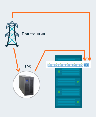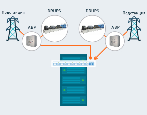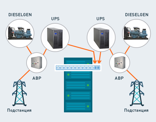 Электропитание в современных ЦОД обычно обеспечивается 2 независимыми вводами, каждый из которых защищён своими источниками бесперебойного питания ИБП (UPS) и дизель-генераторными установками ДГУ (Dieselgen) или дизельными роторными ИБП системами ДРИБП (DRUPS).